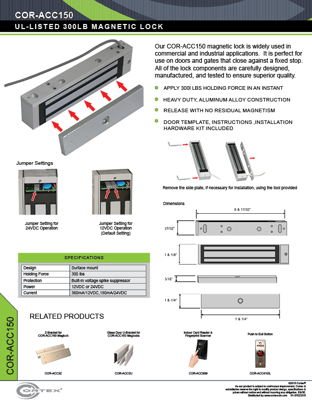 Use this maglock with door brackets COR-ACC3Z, COR-ACC3U, and COR-ACC3L to fit almost any door or gate, including glass doors.
