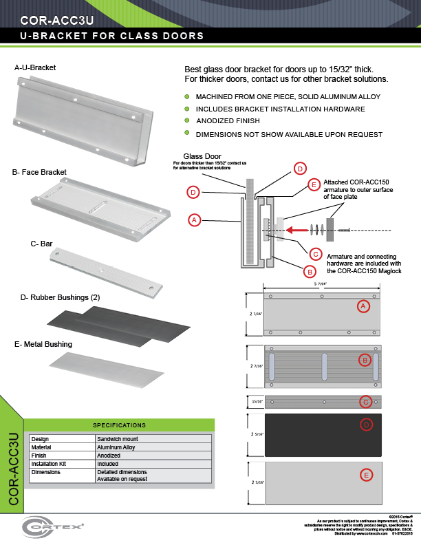This glass door bracket kit is made from solid aluminum. All parts have an anodized finish. Comes with installation kit for use with our COR-ACC150 magnetic lock.