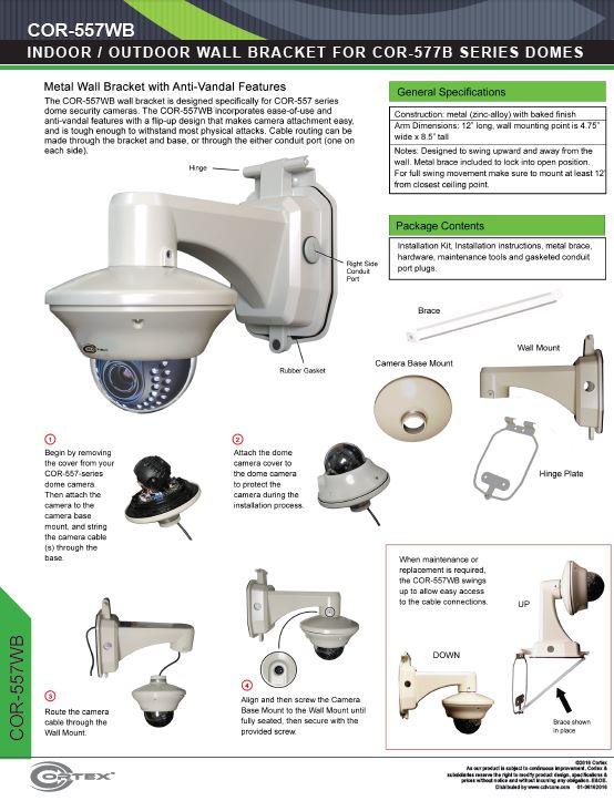 This wall mount bracket is designed to accommodate COR-557-series dome cameras. It is designed for indoor or outdoor use and features a flip-up design that makes connecting cables and performing maintenance tasks a breeze. A rubberized seal keeps the point of wall attachment safe from the weather.