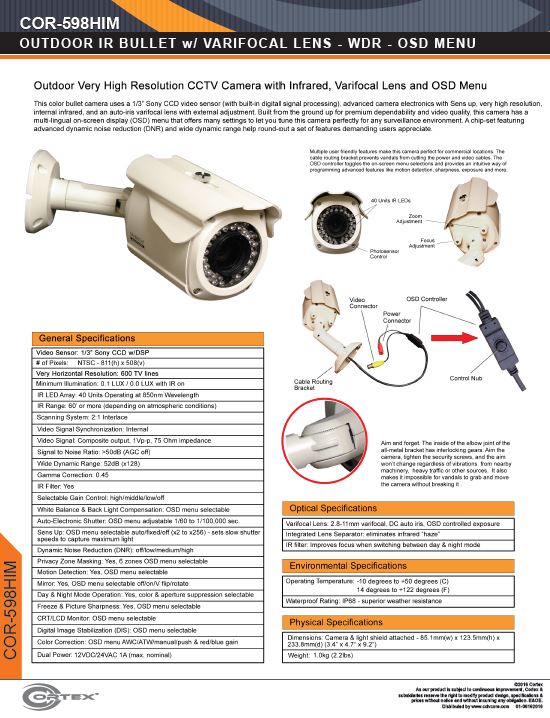 When night time comes, forty infrared LEDs send a blast of IR light up to 65' away from the camera. This automatic system lets the camera operate in ZERO visible light. Picking up intruders in absolute darkness is a standard function for this camera. Video quality remains high when switching to infrared mode thanks to a mechanical IR filter that reduces focus shift, and a manual varifocal lens allows the user to zero-in on exactly what they wish to monitor.