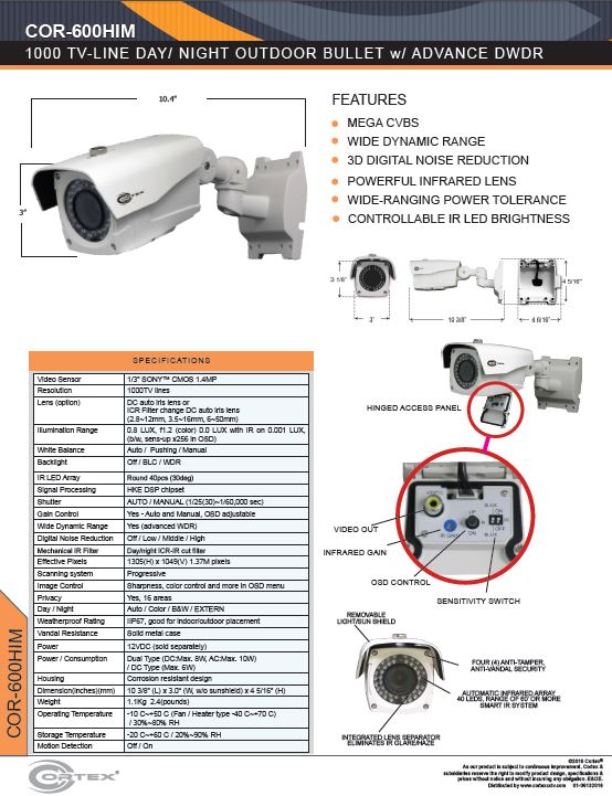 This tough camera, built with standard anti-vandal and anti-tamper features, gives the user sharp 600-line images and has an internal infrared array. The OSD menu has many features the user can adjust for their surveillance environment and images are further protected by an automatic mechanical IR filter that prevents focus shift when switching from day mode (color) to night mode (b/w).