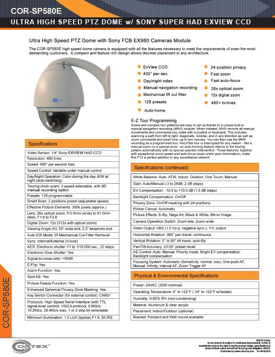 COR-SP580E high speed pan tilt zoom cameras have a zoom factor of 312x total, 360° continuous rotation and are sensitive to infrared light.