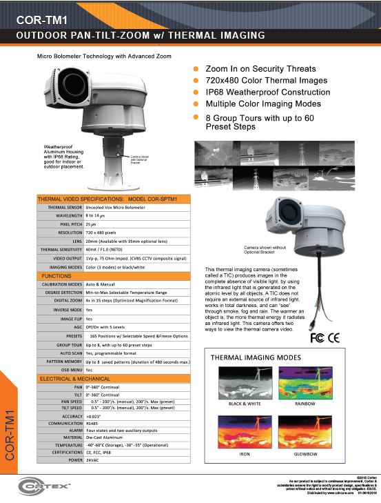 An uncooled VOX Micro Bolometer gives this surveillance camera the ability to "see" thermal energy. Unlike radiant IR systems that require an array of IR producing elements (LEDs, halogen lights, incandescent light bulbs, etc.), thermal imaging systems depend on infrared radiation generated by all warm objects at the molecular level. By using an uncooled VOX micro bolometer, surveillance camera technology can now offer thermal imaging at affordable prices. Great for perimeter detection, and use in places prone to fog and rain, or smoke.Turn rate is up to 200?/sec under manual or preset control.